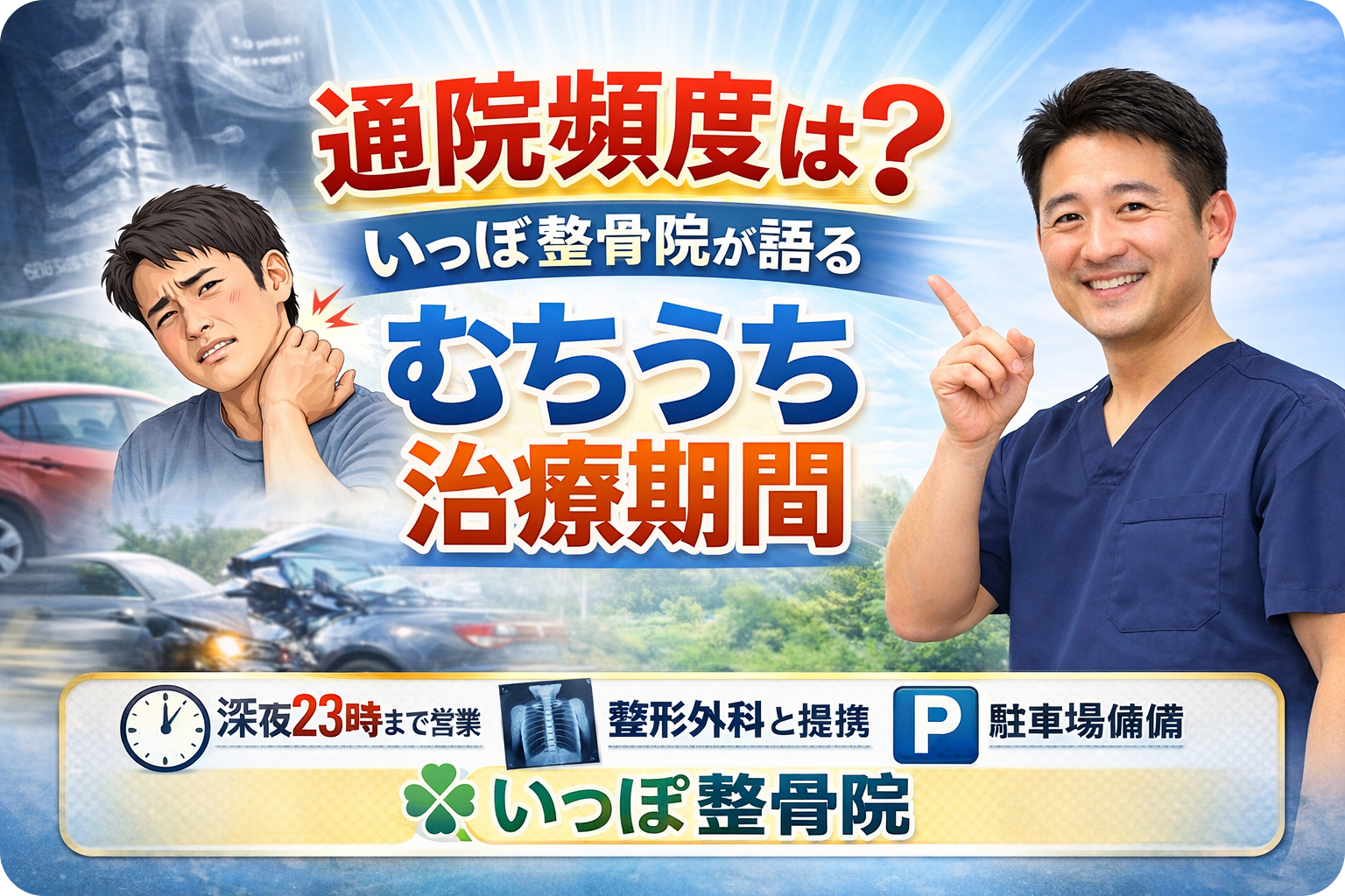 こうした声にお応えすべく、いっぽ整骨院では年間100件を超える交通事故によるむちうち症例に対応してきた経験をもとに、症状別の治療期間の目安や、適切な通院頻度についてわかりやすく解説していきます。