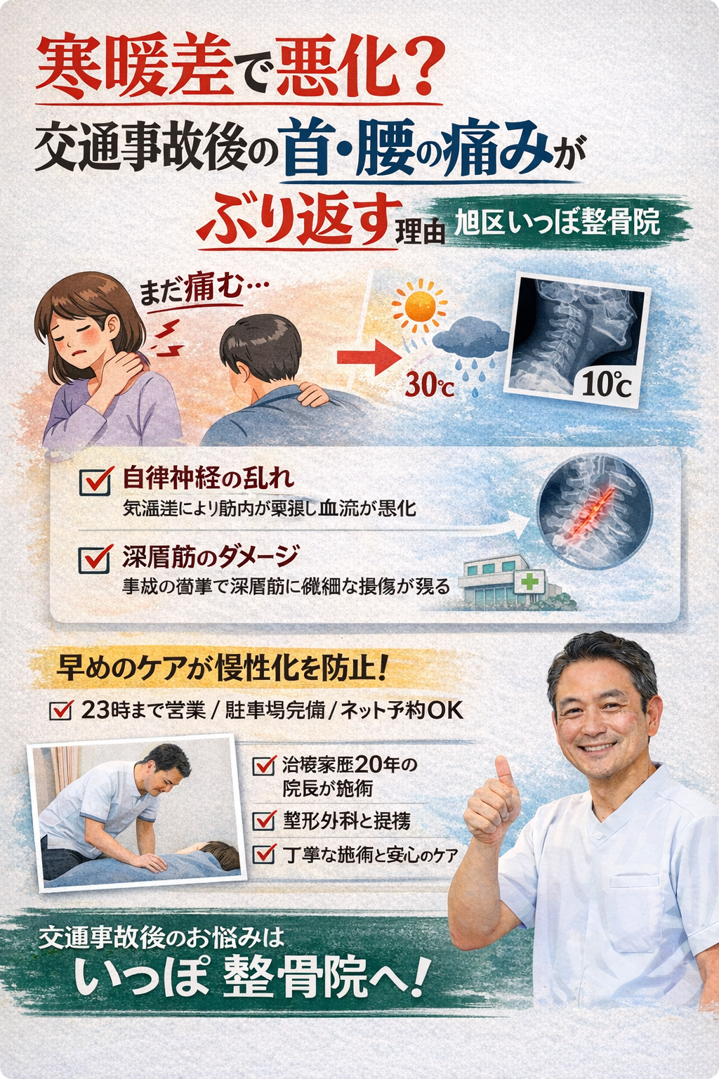 寒暖差で悪化?交通事故後の首・腰の痛みがぶり返す理由|旭区いっぽ整骨院